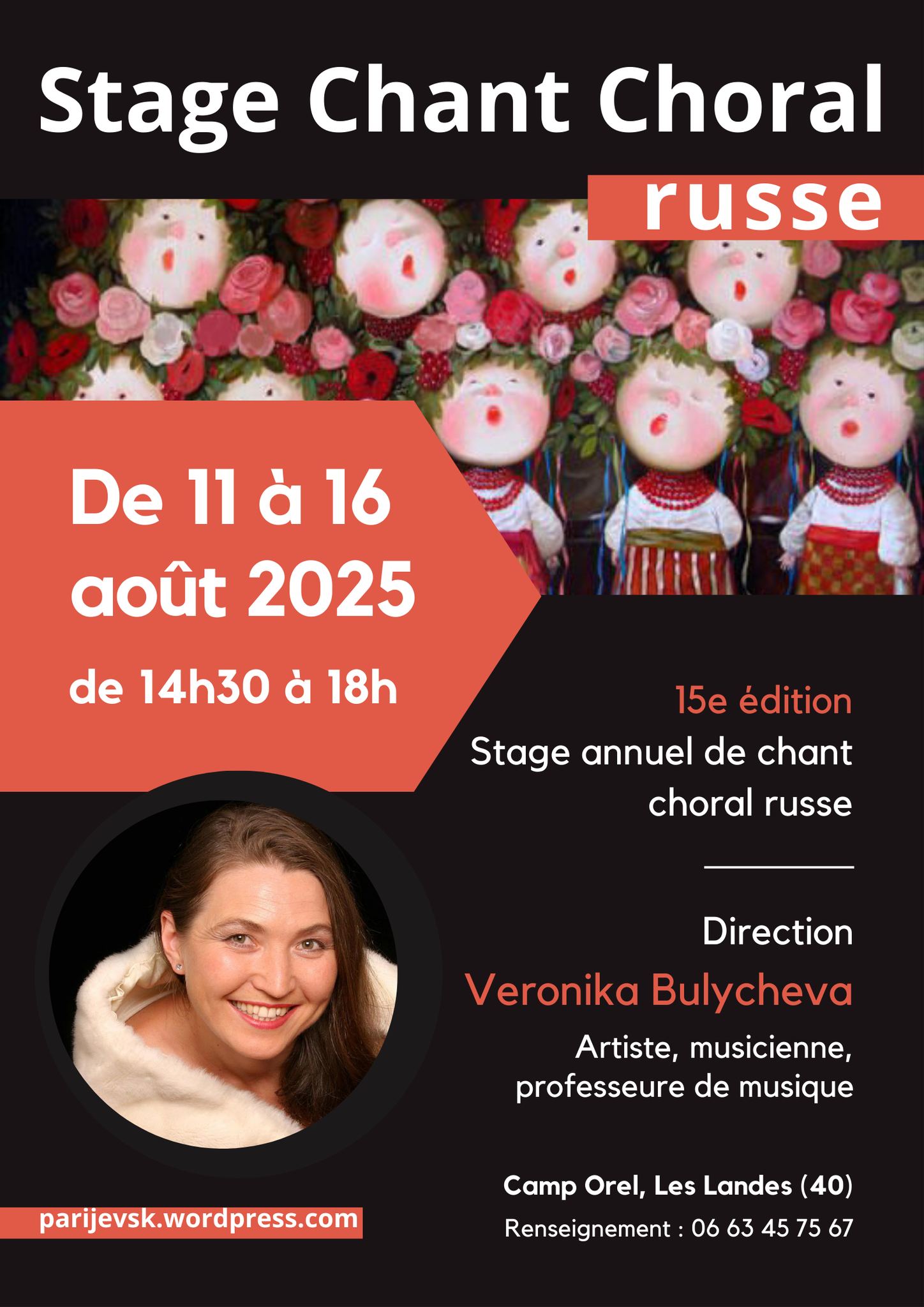 Cet été aura lieu la 15e édition du Stage de Chant Choral Russe sous direction de Veronika Bulycheva qui se déroulera du 11 au 16 aout 2025 au Camp Orel (les Landes).